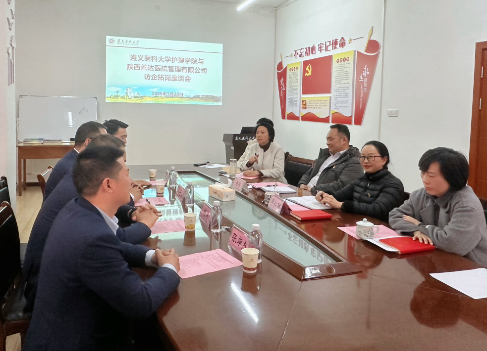 3月20日上午10:30,388vip太阳集团与陕西善达医院管理有限公司在大连路校区荣殿楼7楼会议室举行“访企拓岗促就业”校企合作座谈会。公司党委副书记、经理邓仁丽,党委副书记陈伟,党委委员、副经理王连红及毕业年级老师参会。座谈会由陈伟副书记主持。