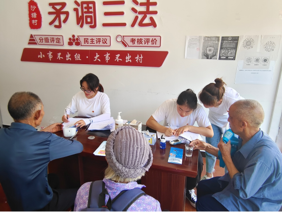 设点送健康。11日上午7:00,实践团的师生们在沙塘村村委会门口设立健康服务点,为前来赶集的老人量血压、测血糖,采用理论讲解和现场实操相结合的方式讲授心肺复苏、海姆立克急救法等急救知识,就老人慢性病防治情况、心理健康状况等内容开展调研。同时,向老人们发放健康宣传手册,普及健康知识。