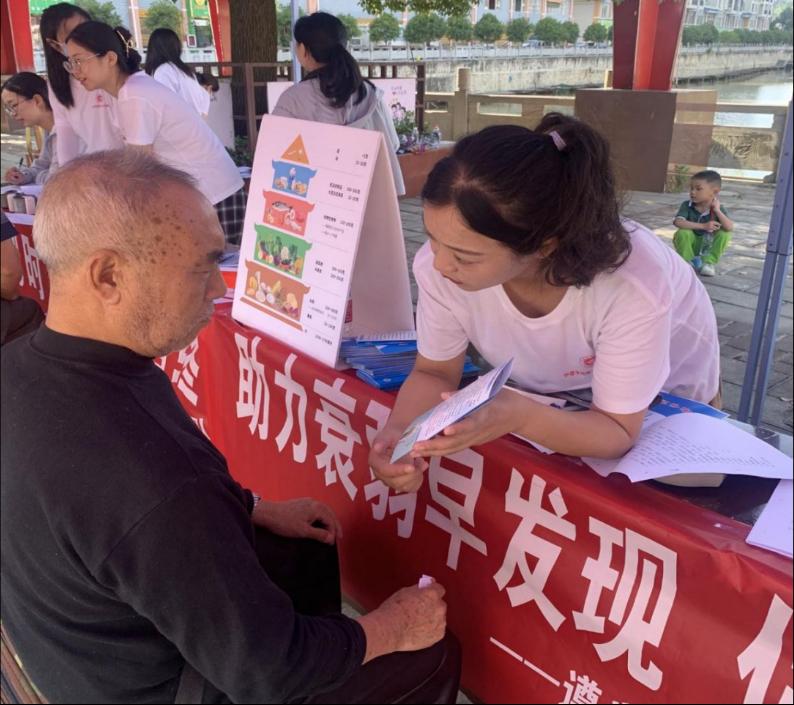“助力衰弱早发现,促进健康老龄化”衰弱筛查实践小分队对老年人进行衰弱筛查,宣传老年衰弱的预防措施,如科学膳食、正确运动、健康生活方式等。