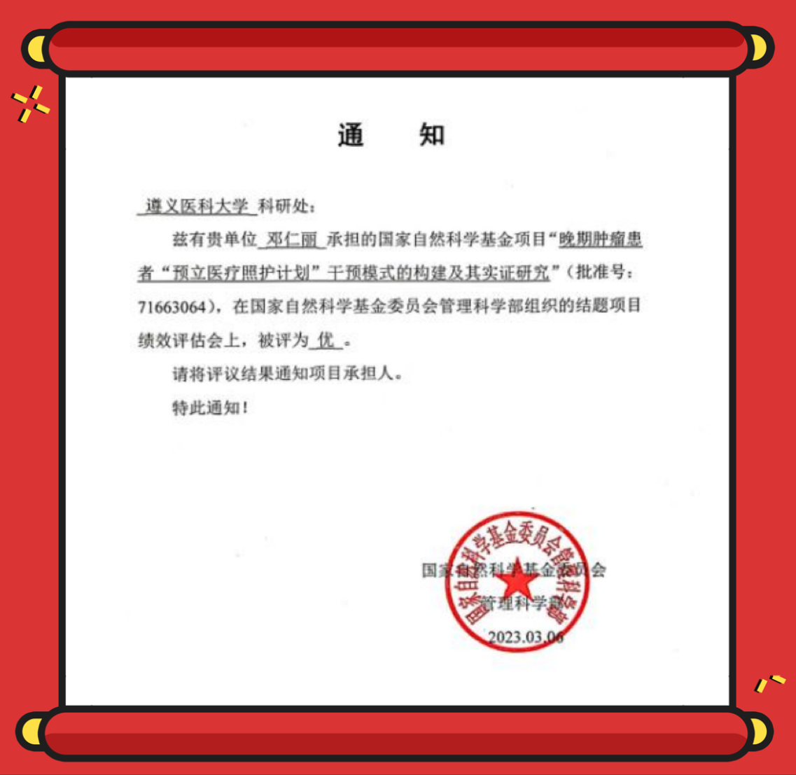 日前,公司博士生导师邓仁丽教授主持的国家自然科学基金项目《晚期肿瘤患者“预立医疗照护计划”干预模式的构建及其实证研究》,在国家自然科学基金委员会管理科学部发布结题项目绩效评估中被评为“优秀”,这是学校首个获评“优秀”的结题项目。国家自然科学基金委员会每年获评优秀项目数仅占当年结题项目总量的20%左右,主要从项目研究水平、成果质量等进行绩效评估。