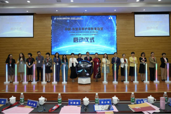 领导和嘉宾共同启动水晶球和水晶柱,一起见证中国—东盟高等护理教育联盟正式成立。