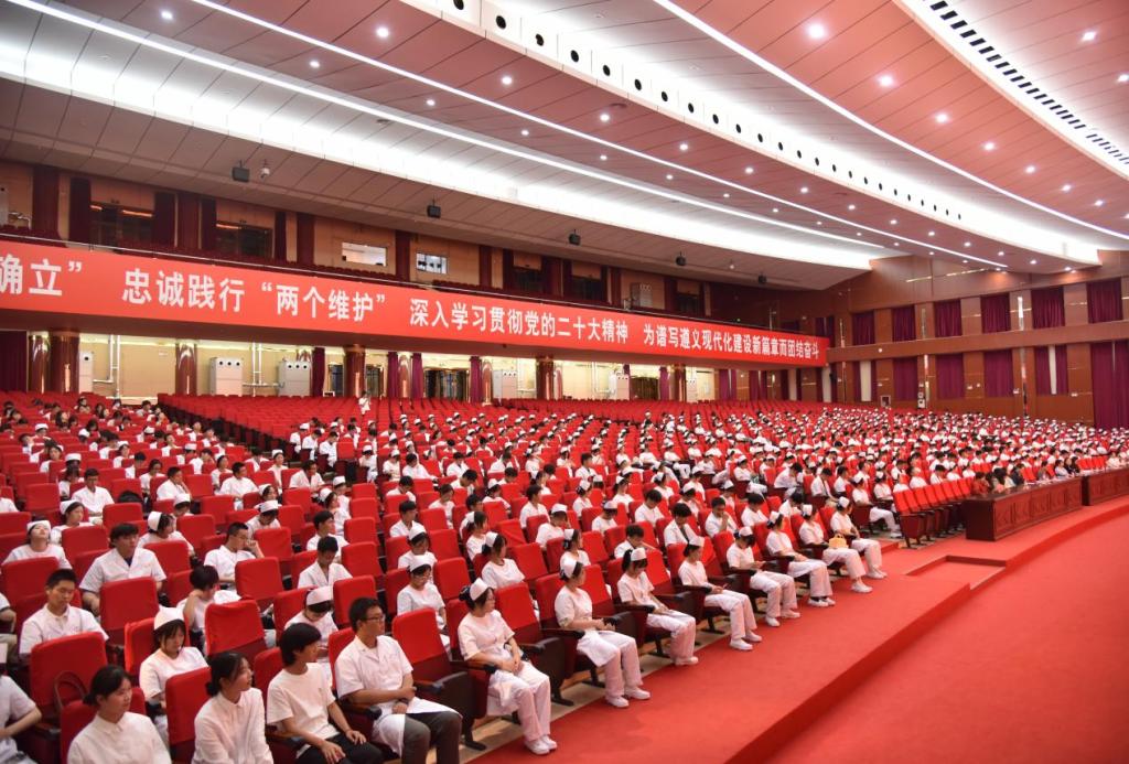 回看遵医过往,争做护理新人。会前,全体新生一同观看公司宣传片,了解公司发展历程,回望遵医及遵医护理的峥嵘岁月。随后,大会在庄严的国歌声中拉开序幕。公司党委书记张咏梅在会上致欢迎词,对2023级新同学的到来表示热烈欢迎,并提出四点要求:一是要坚定理想信念;二是要勇于担当奉献,三是要敢于磨砺吃苦;四是要乐于奋斗拼搏,希望大家在新的征程中,感党恩、听党话、跟党走,不负韶华、不负时代、不负人民,用实际行动践行“请党放心、强国有我”的青春誓言,努力成为一名堪当民族复兴重任的遵医护理新人!
