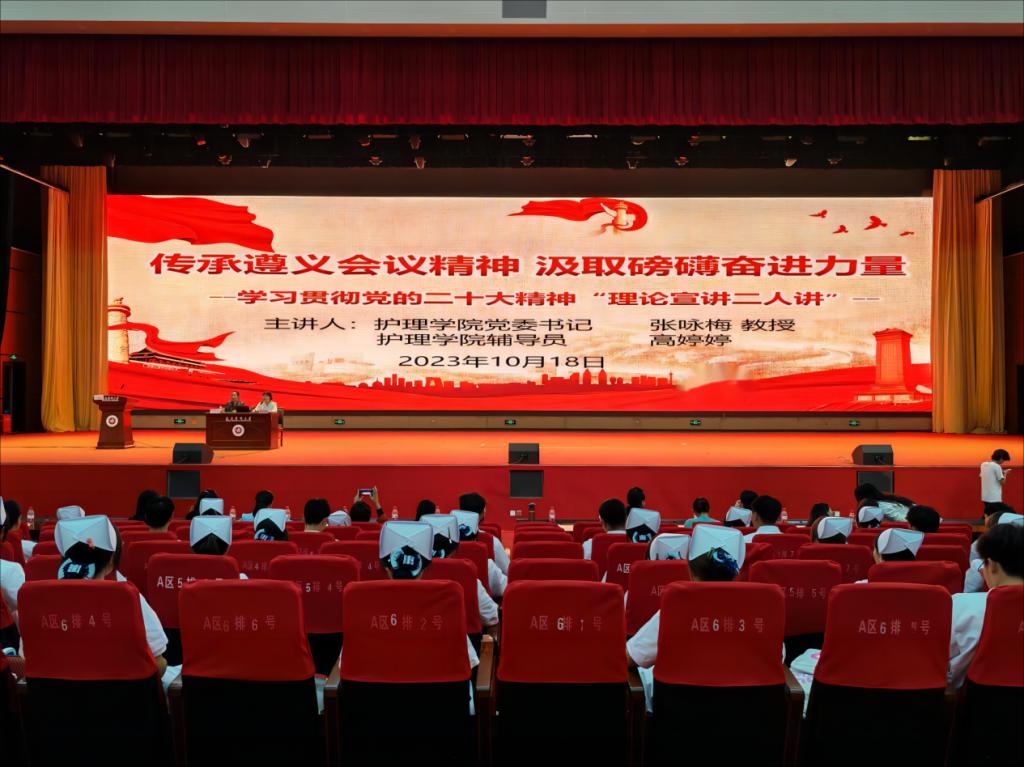 树立远大理想,勇担时代重任。党委书记张咏梅和辅导员高婷婷老师以“传承遵义会议精神 汲取磅礴奋进力量”为题,采取理论宣传二人讲的方式宣讲党的二十大精神,向同学们详细讲解了遵义会议的精神内涵和启示,以及作为新时代医学青年如何走好新时代长征路,希望大家深刻领会遵义会议精神内涵,传承红色基因,赓续红色血脉,用实际行动践行红医精神,做有理想、敢担当、能吃苦、肯奋斗的新青年。
