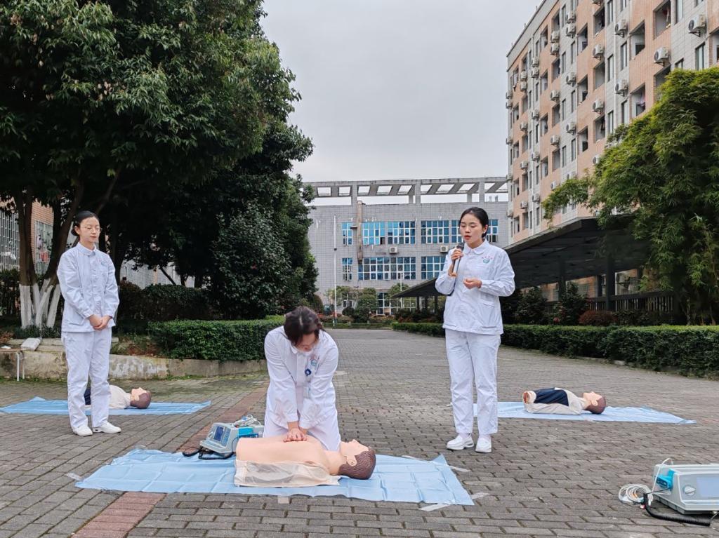 活动现场,陈伟副书记讲话,希望同学们通过对急救知识的学习,树立敬畏生命、尊重生命的责任意识,勉励同学们要珍惜实践机会,将课堂所学转化为服务社会的本领,用专业守护健康,用爱心传递温暖。此次活动邀请了附属医院急诊科教师何婧、程婷、王玉林,她们结合实际案例,用通俗易懂的语言向师生们详细讲解了心肺复苏法、海姆立克急救法、“急救神器”AED的使用等常见急救知识,并带领10名员工志愿者进行了急救技能示范与教学。在分组实操演练中,师生们踊跃参与,通过模拟人道具练习急救手法,并逐一进行指导,现场学习氛围热烈。同时,活动还穿插了心理健康疏导、艾滋病预防知识宣讲等环节,帮助师生树立科学健康理念,增强自我防护意识。