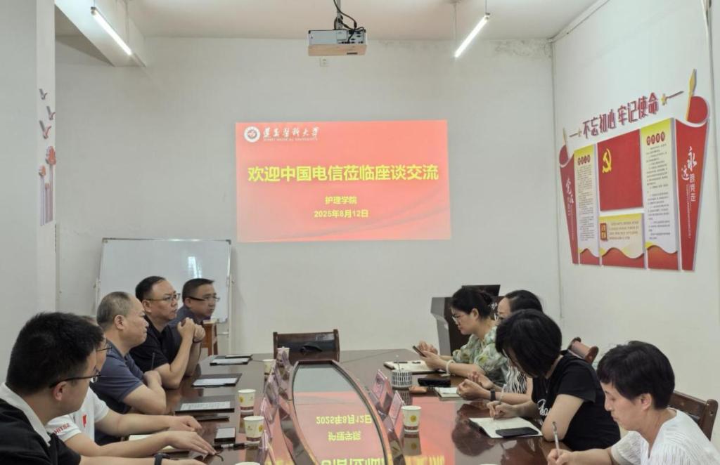 2025年8月12日上午,中国电信股份有限公司遵义分公司法人代表任飞等一行5人来院开展座谈交流。护理公司党委副书记、经理邓仁丽,党委委员、副经理王连红及相关科室负责人参会,会议由邓仁丽主持。