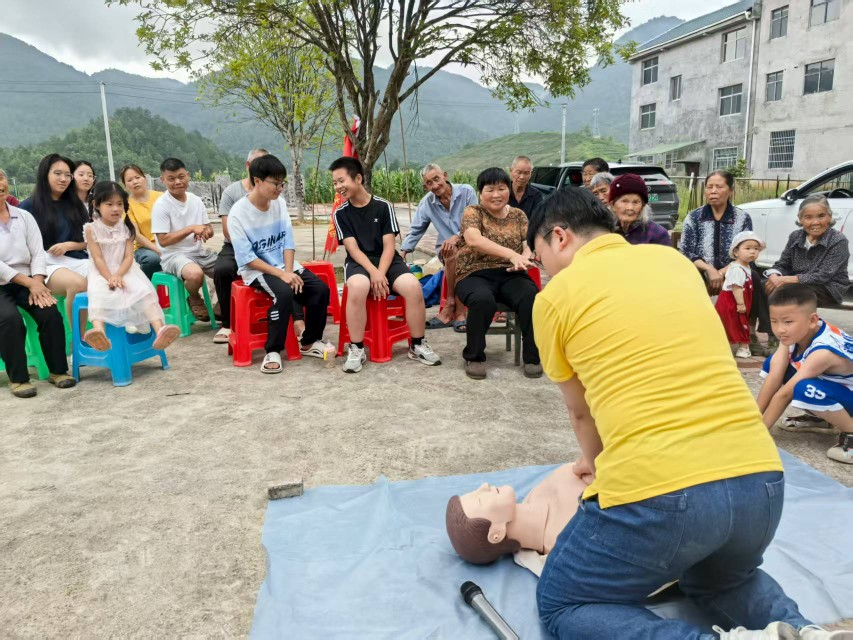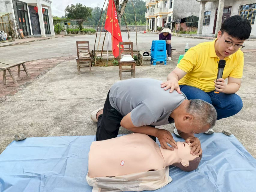 健康科普,情系桑榆。实践队员们走村入户,将健康知识送到老人身边。他们细致讲解海姆立克急救法、心肺复苏术的操作要领,并手把手指导老人进行实操演练,确保老人能掌握关键急救技能。此外,队员们发放蜂蜇伤、蛇虫咬伤、防溺水、防中暑等健康宣传册,并以通俗易懂的语言进行科普宣教。