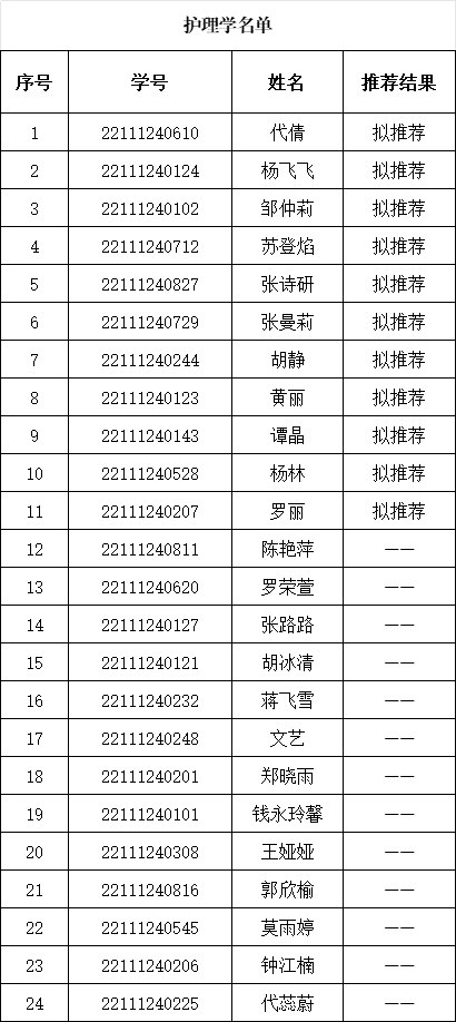 388vip太阳集团根据《388vip太阳集团关于开展2026年推荐优秀应届本科生免试攻读硕士研究生工作的通知》,按照公平、公正、公开的原则开展了推荐工作。名额为护理学专业11人,助产学专业3人。经过员工本人申请、公司资格审查、推免生遴选工作小组讨论研究,现将2026年拟推荐优秀应届本科毕业生免试攻读硕士研究生名单进行公示(按照推免总成绩排名顺序)。